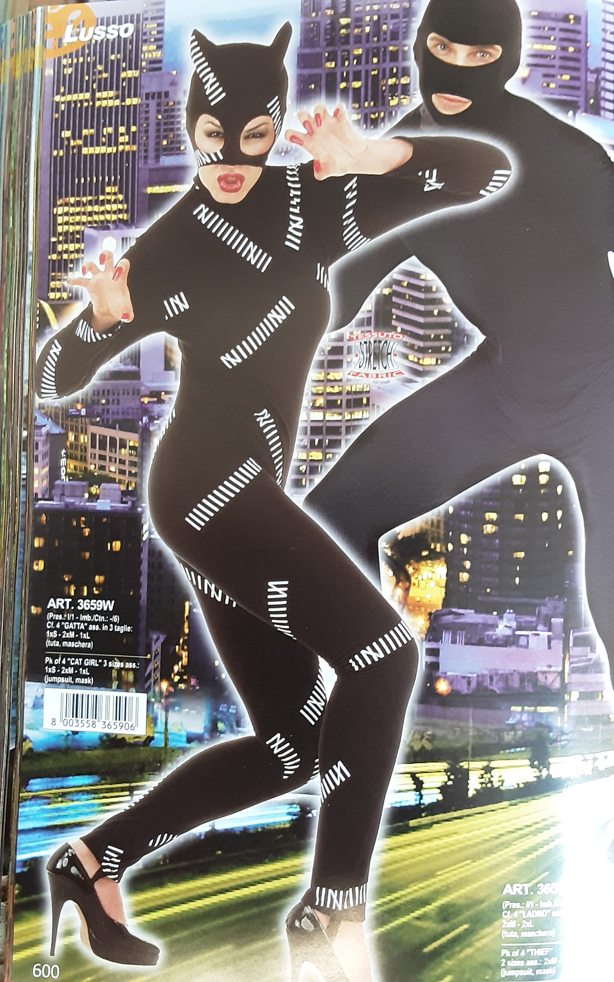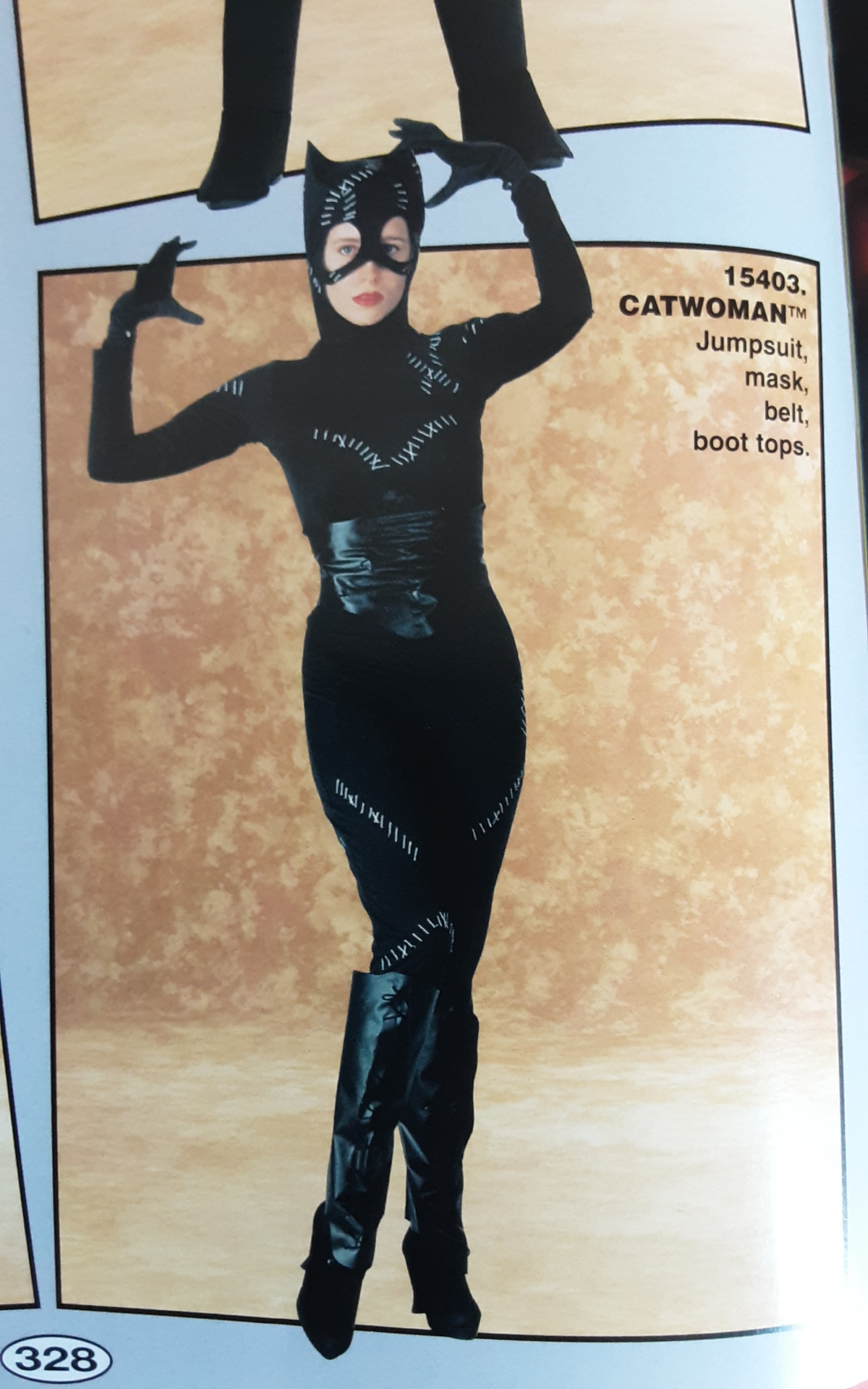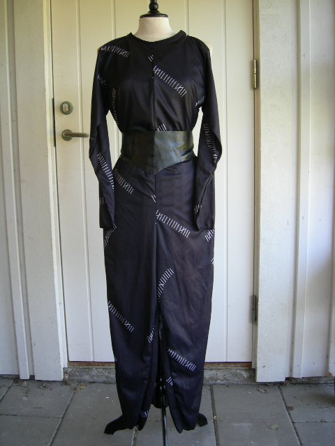 Catwoman overall med mask, skärp och bootcovers. Overallens grenmått är ca 150 cm, övervidd ca 85 cm, midja ca 80 cm.