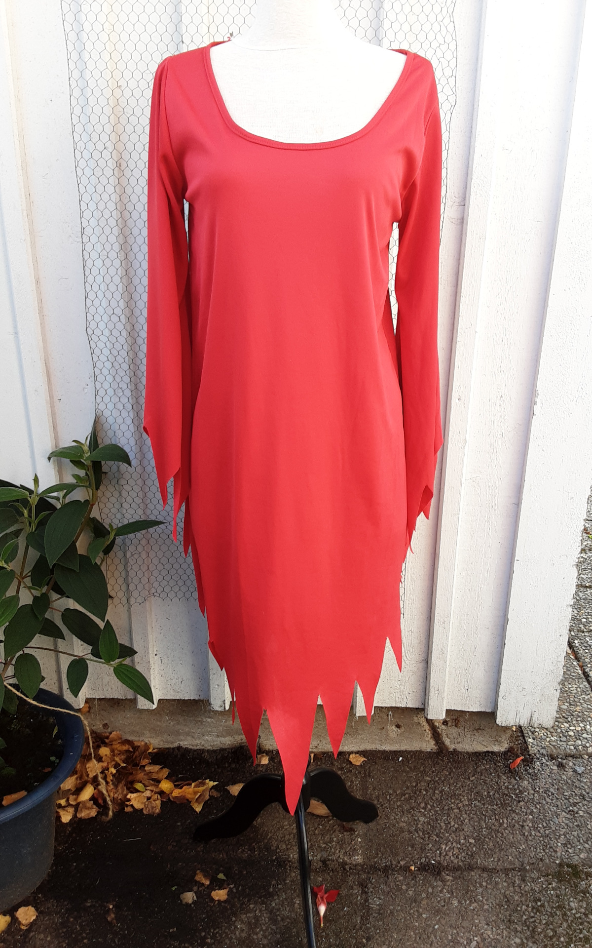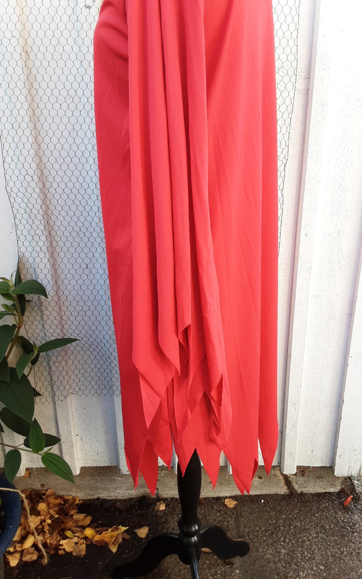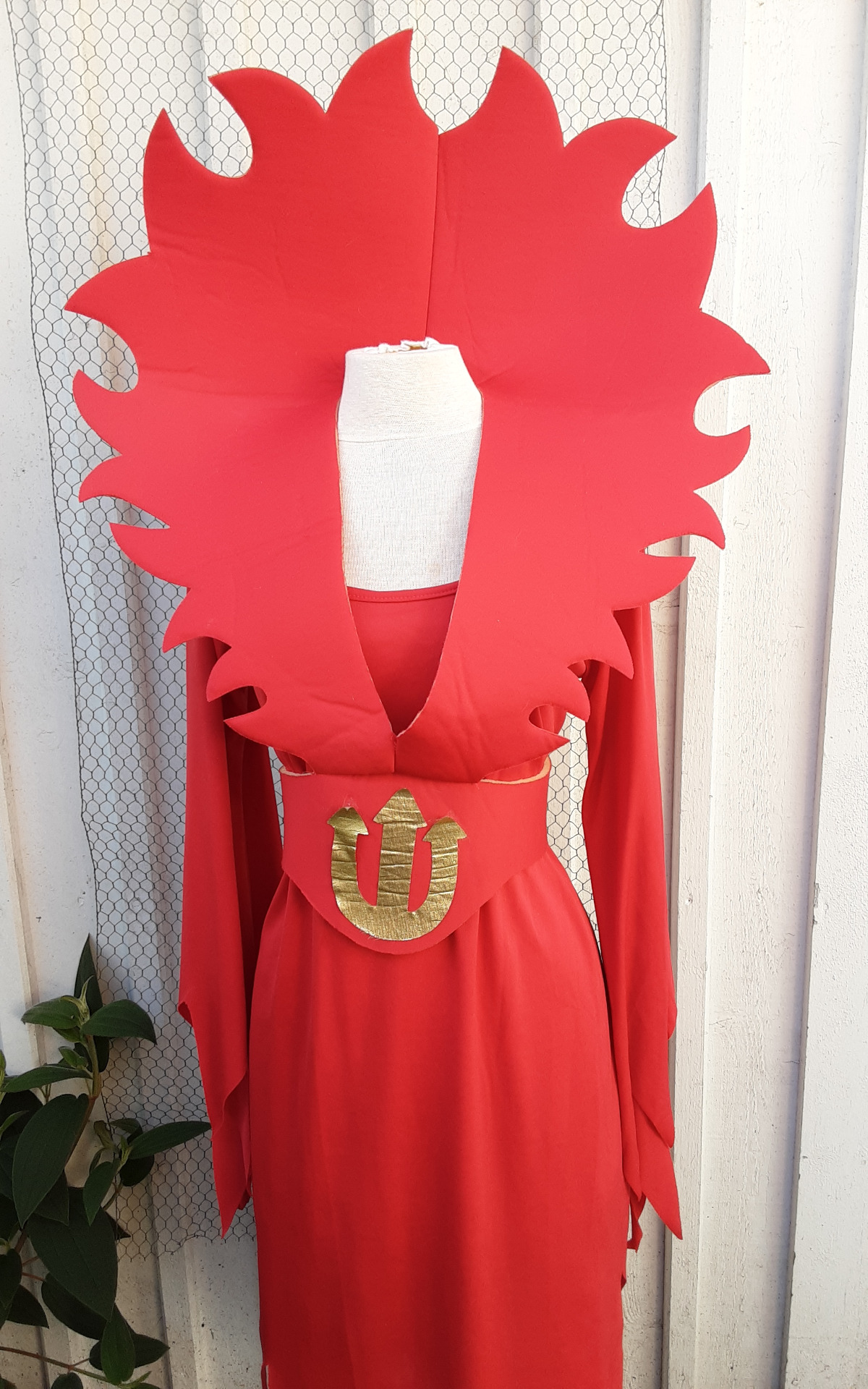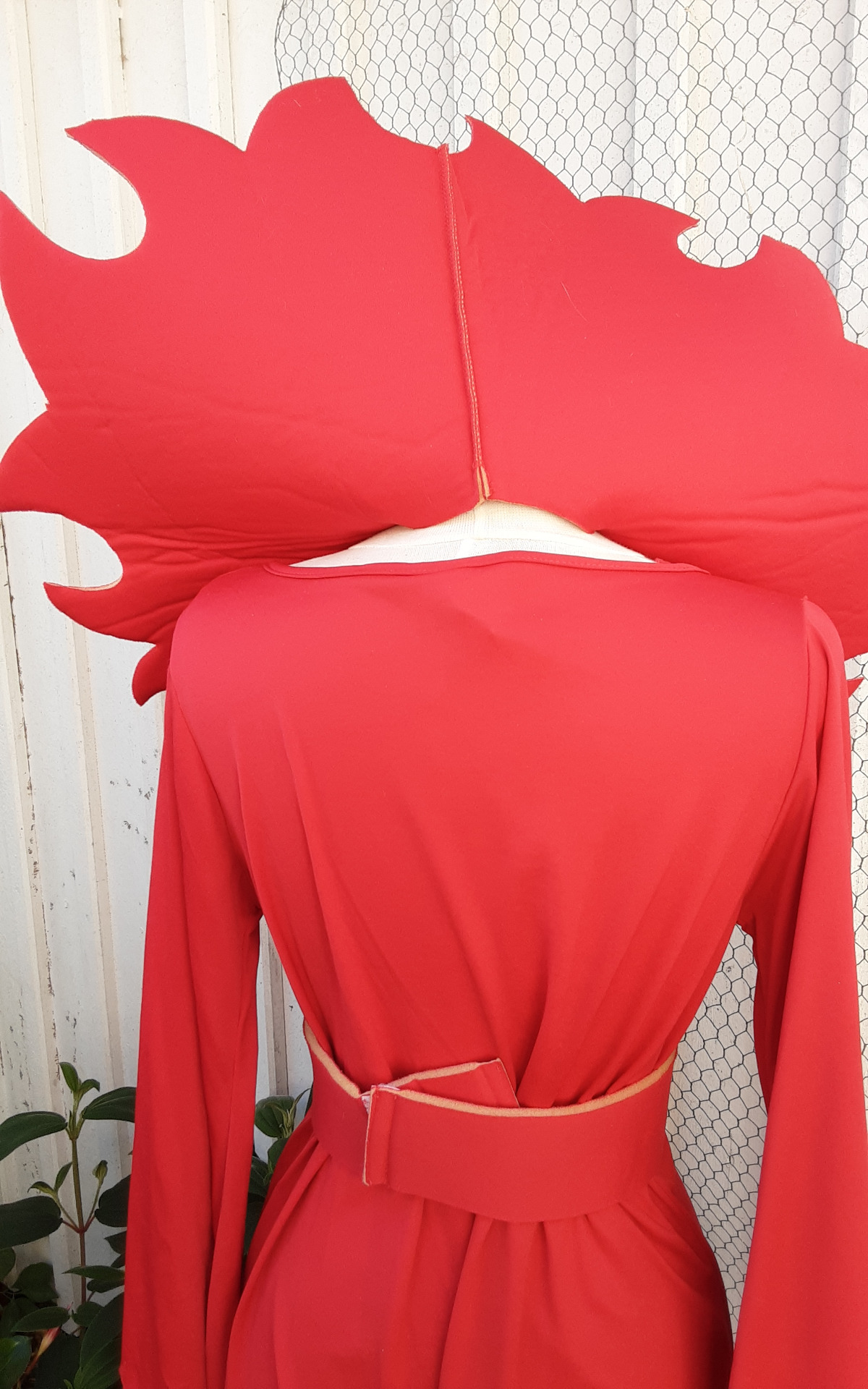 Röd klänning med stor krage och skärp. Kragen är lös och sitter fast i skärpet. Storleken beräknas till tonår. Övervidd ca 100 cm.