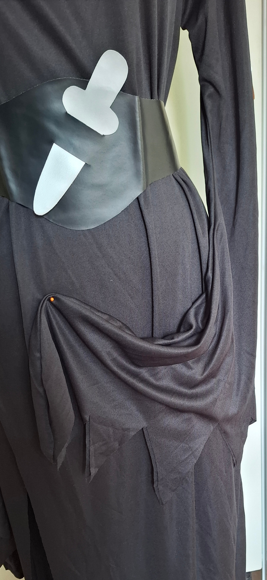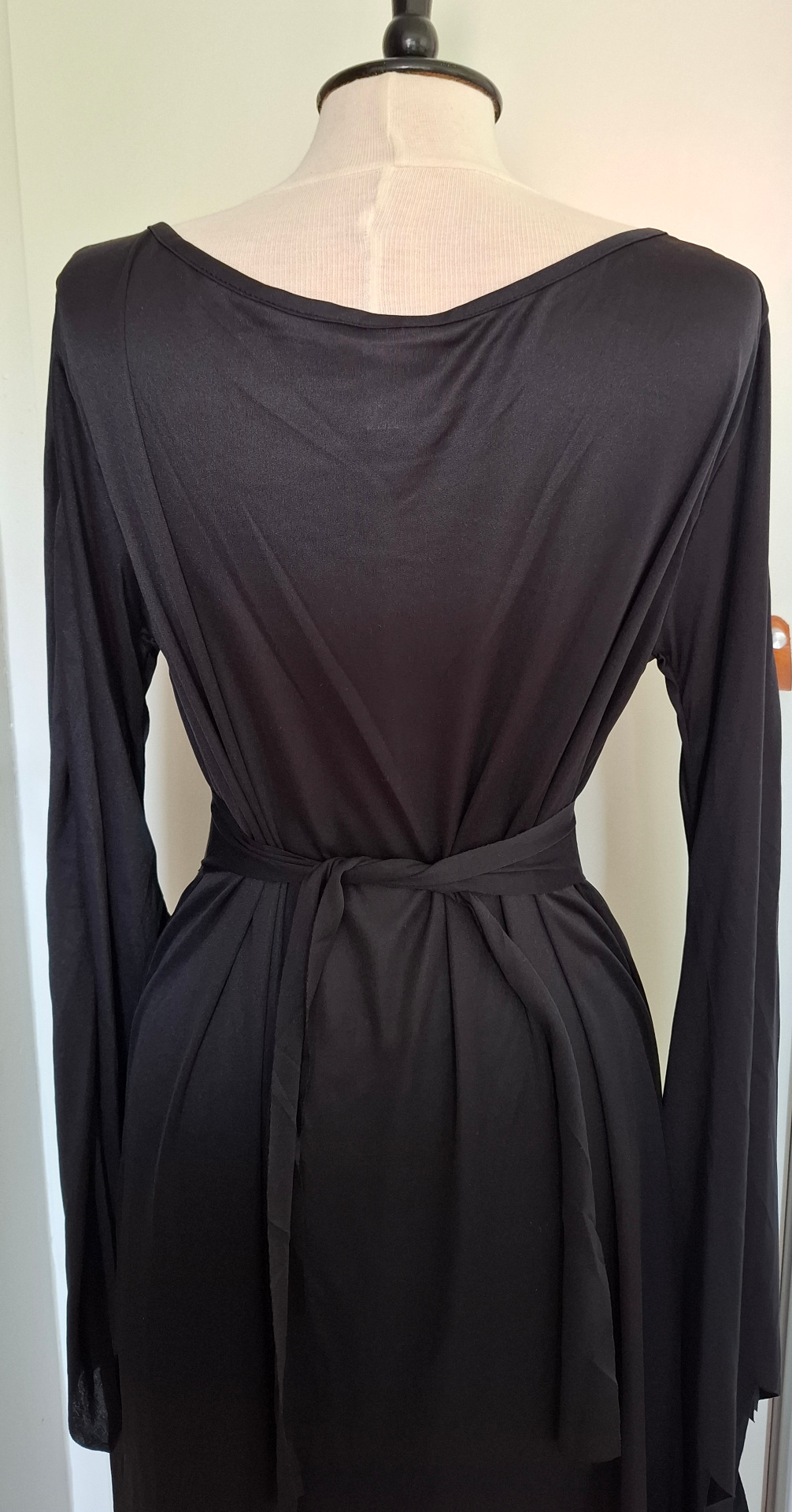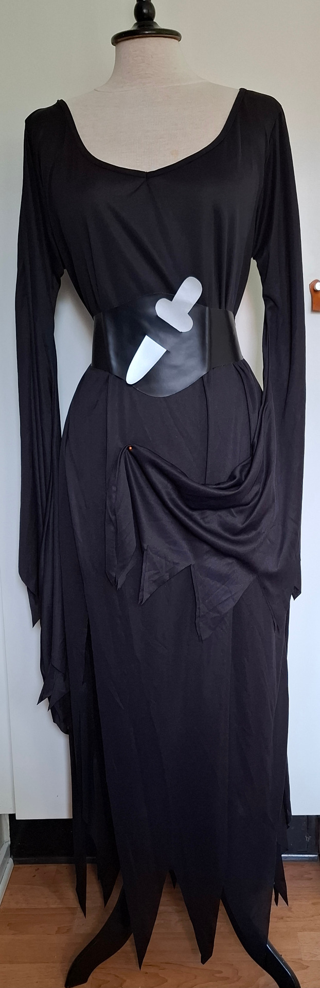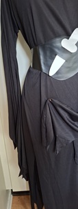 Svart klänning med långa flikiga ärmar och flikig nederkant med sprund. Skärp med fejk kniv i silvertyg. Övervidd ca 108 cm. Klänningen är ganska stor i halsen men går att hålla in med veck.