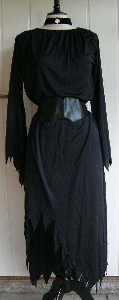 Enkel häxklänning med resår i hals och sprund i sidan. Storlek ca M, övervidd ca 120 cm. Skärp och halsband medföljer.