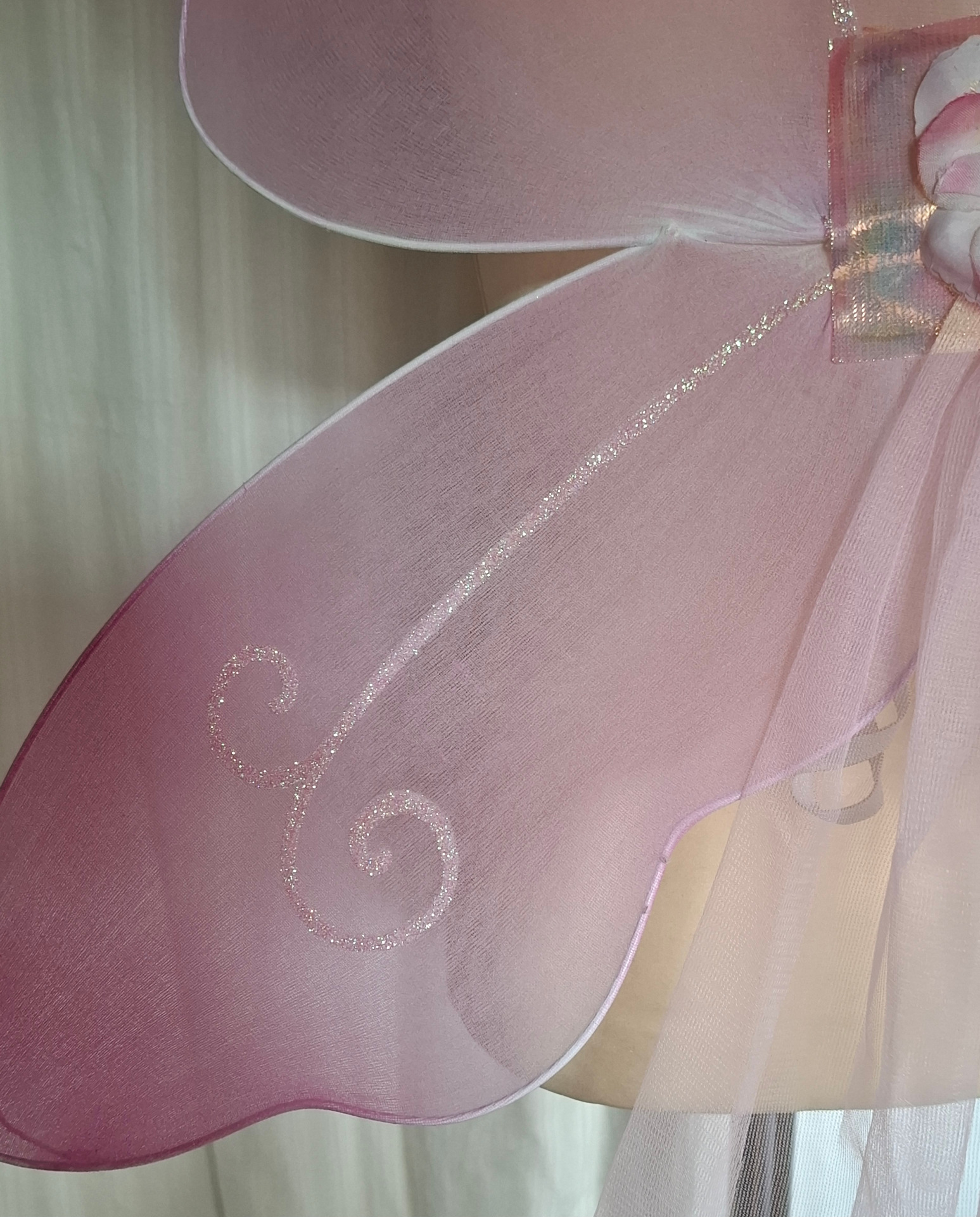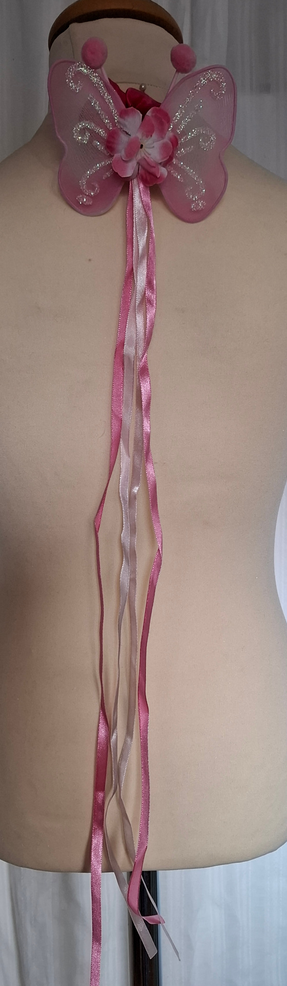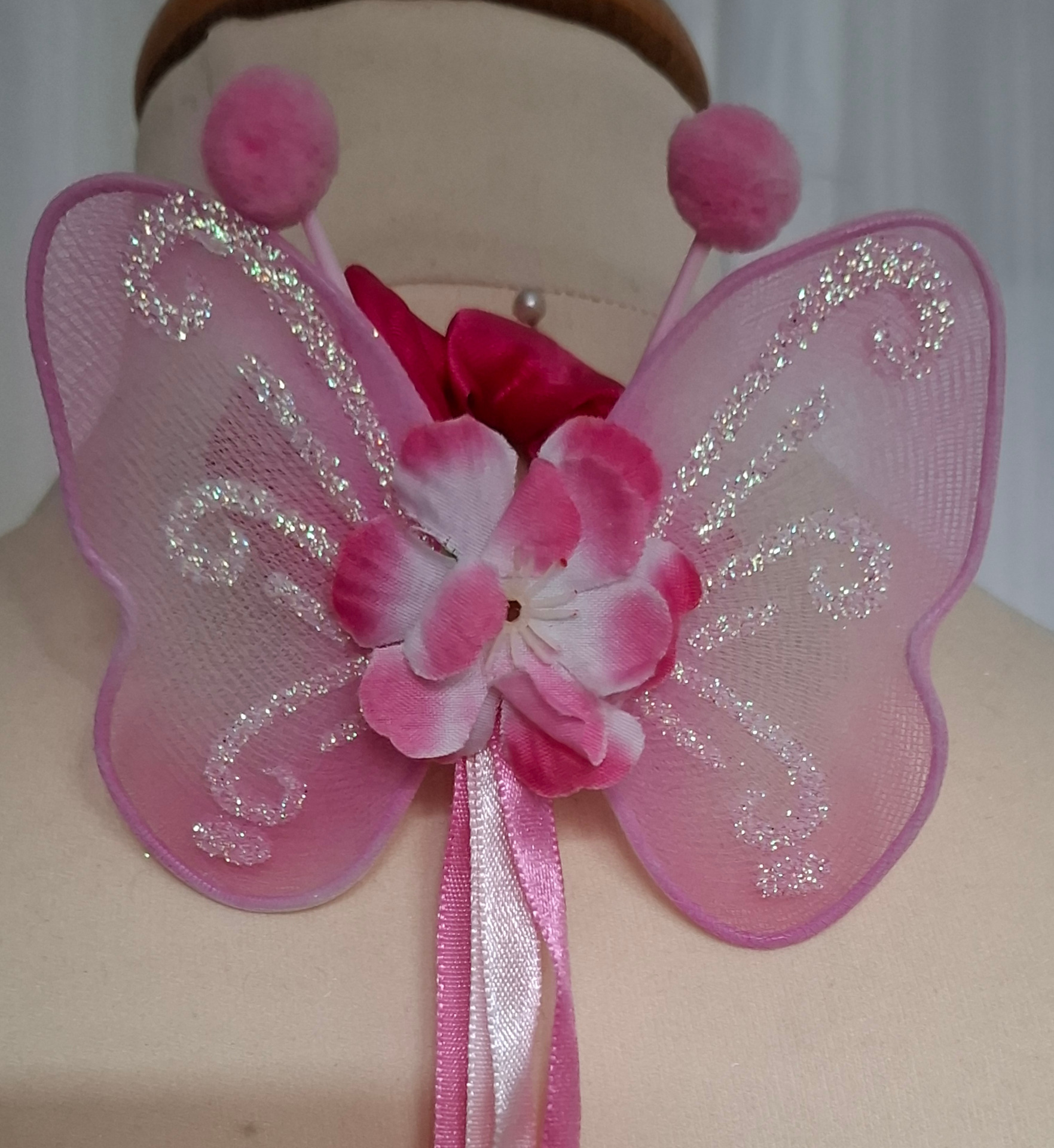 Rosa vingar till fée eller fjäril, diadem med dun och stjärna, hårsnodd med fjäril. Vingarna är ca 60 cm långa.