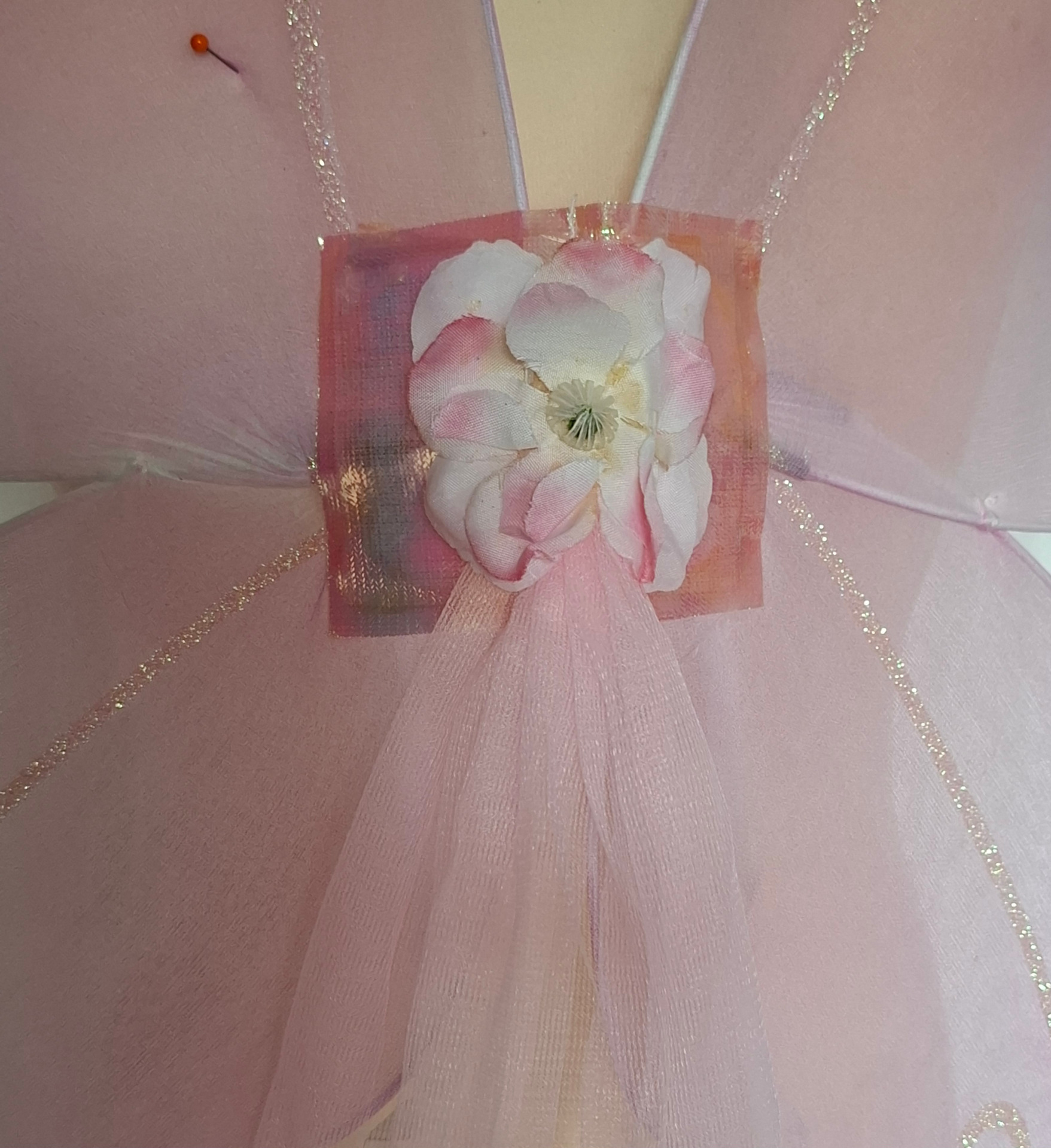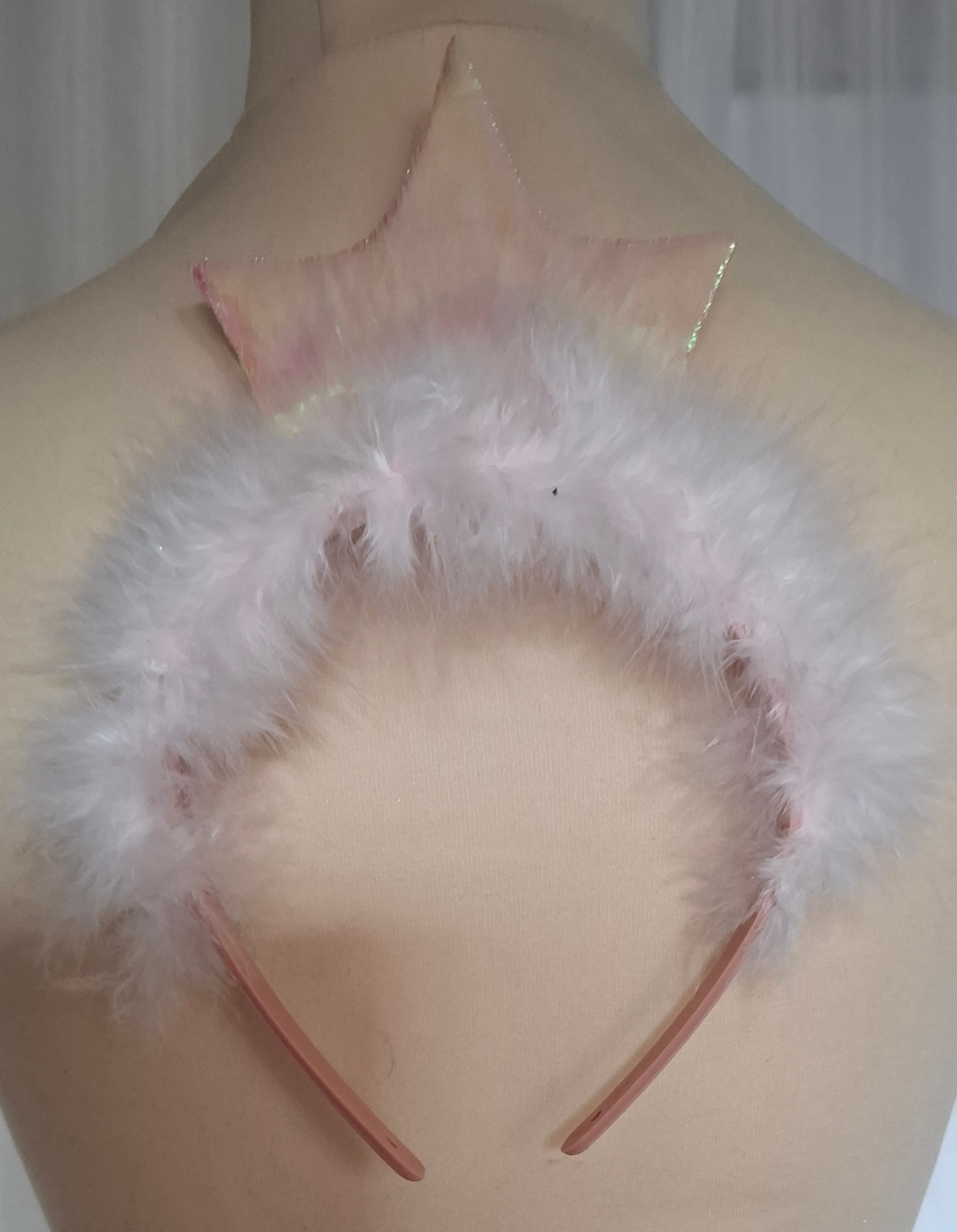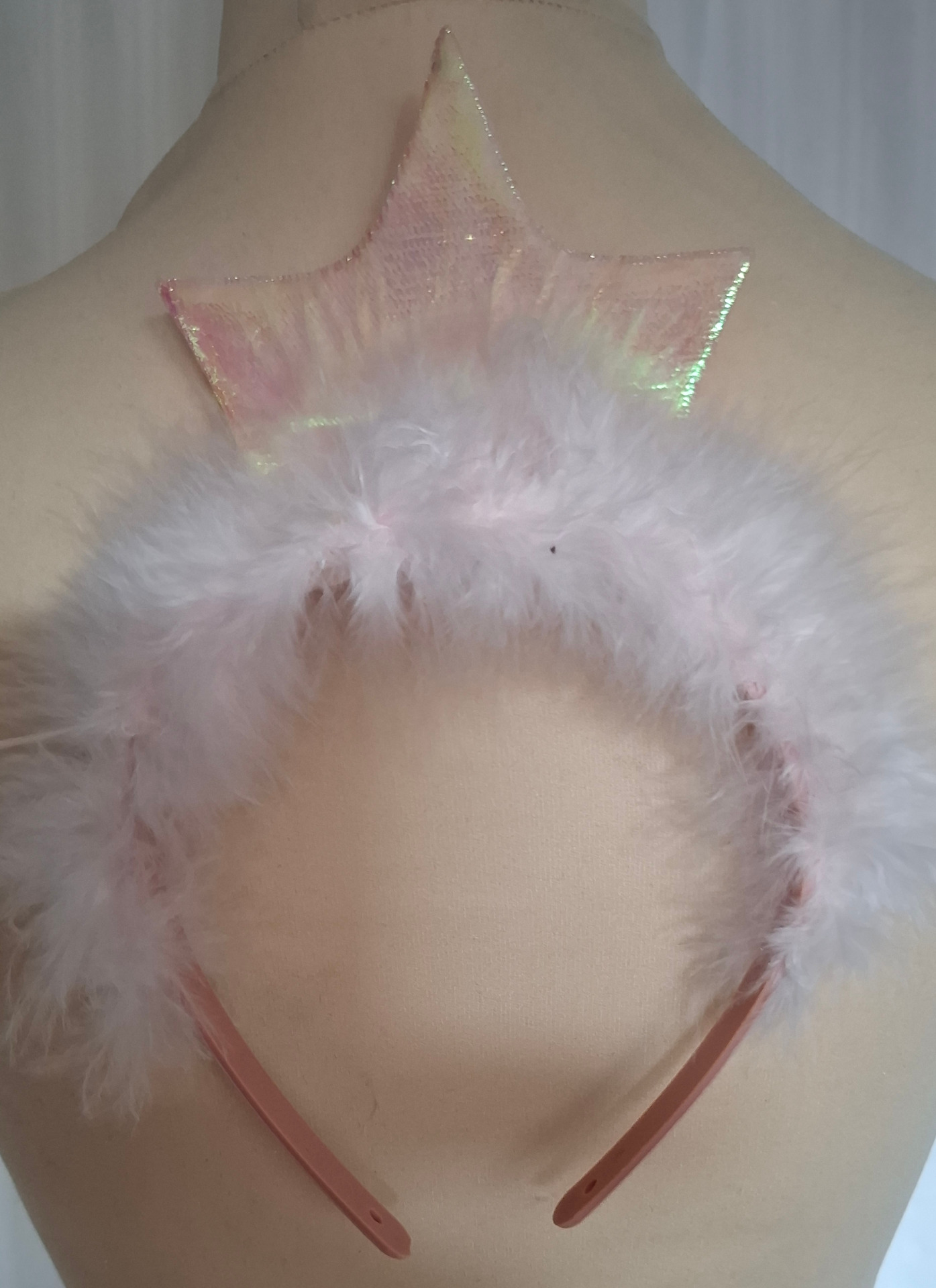 Rosa vingar till fée eller fjäril, diadem med dun och stjärna, hårsnodd med fjäril. Vingarna är ca 60 cm långa.
