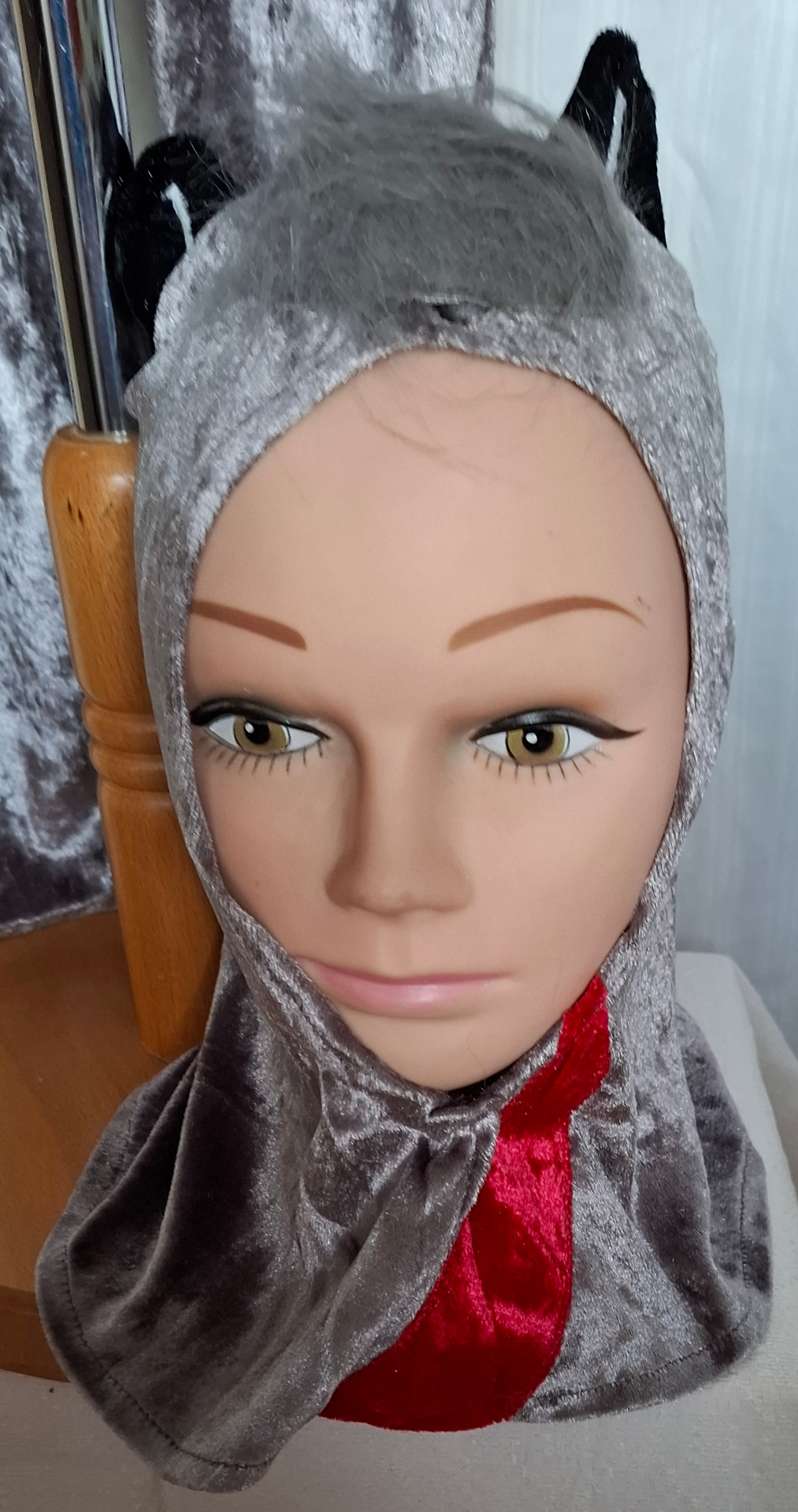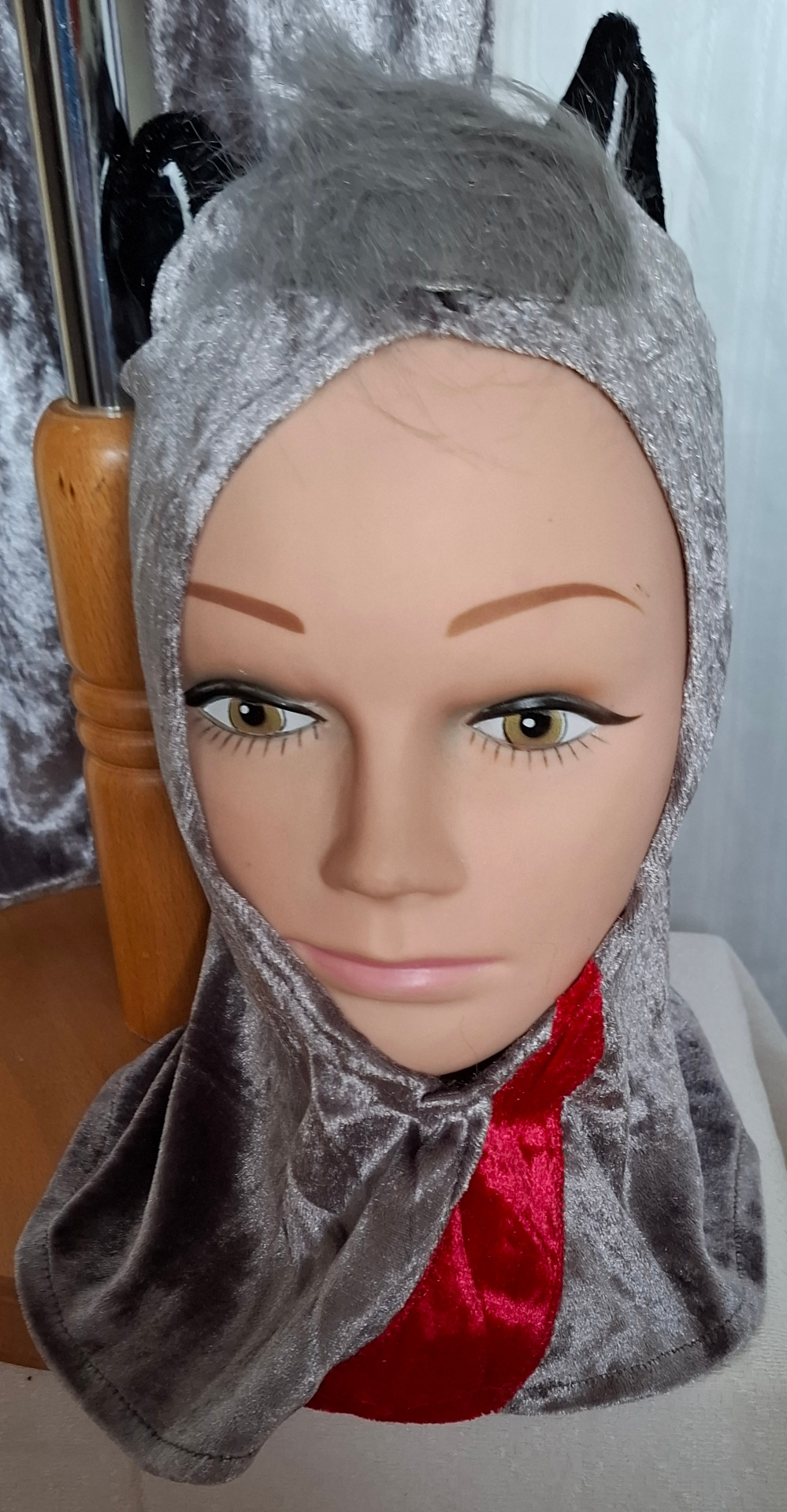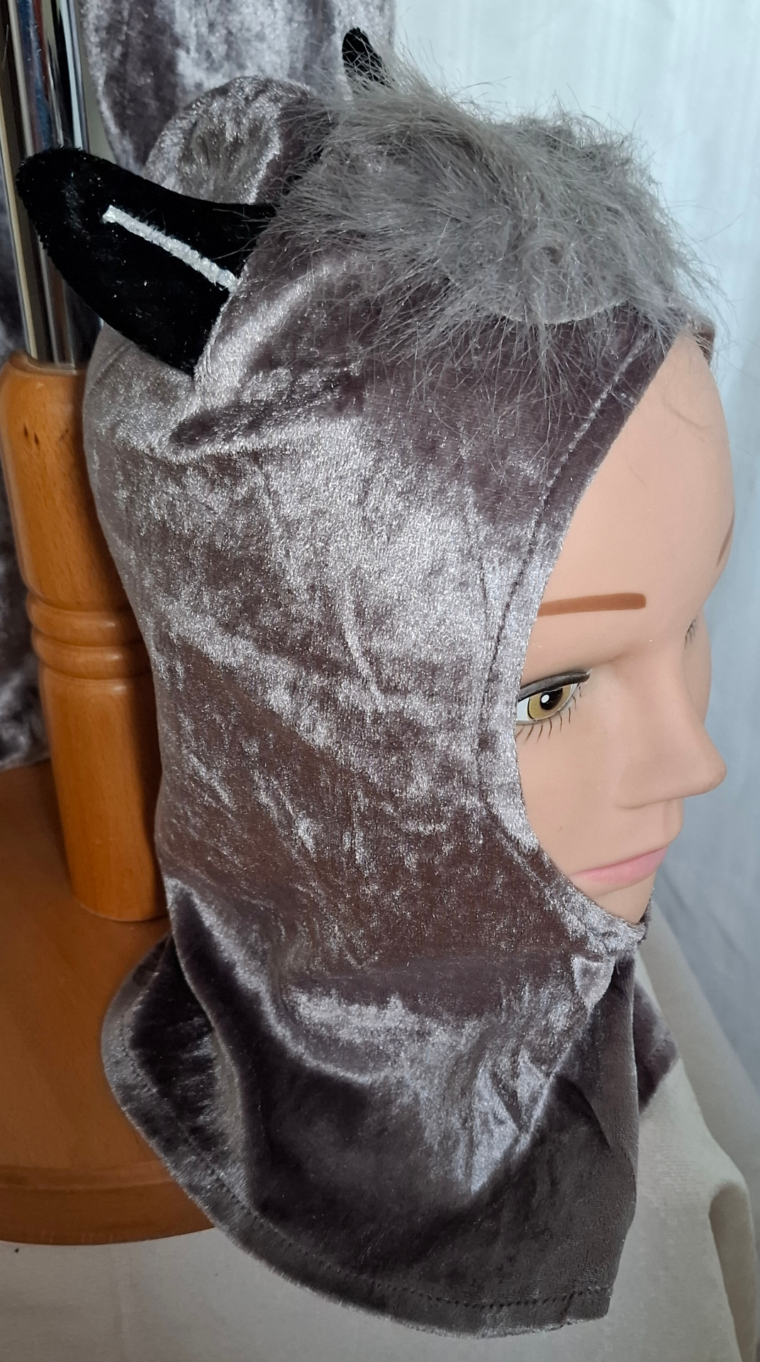 Fladdermus i 3 delar, tröja, byxor och huva. Materialet är stretch sammet. Tröjan har mått: övervidd ca 80 cm och längd bak ca 54 cm. Byxor: Midja ca 76 cm, innerben längd ca 44 cm. Helt ny, oanvänd.