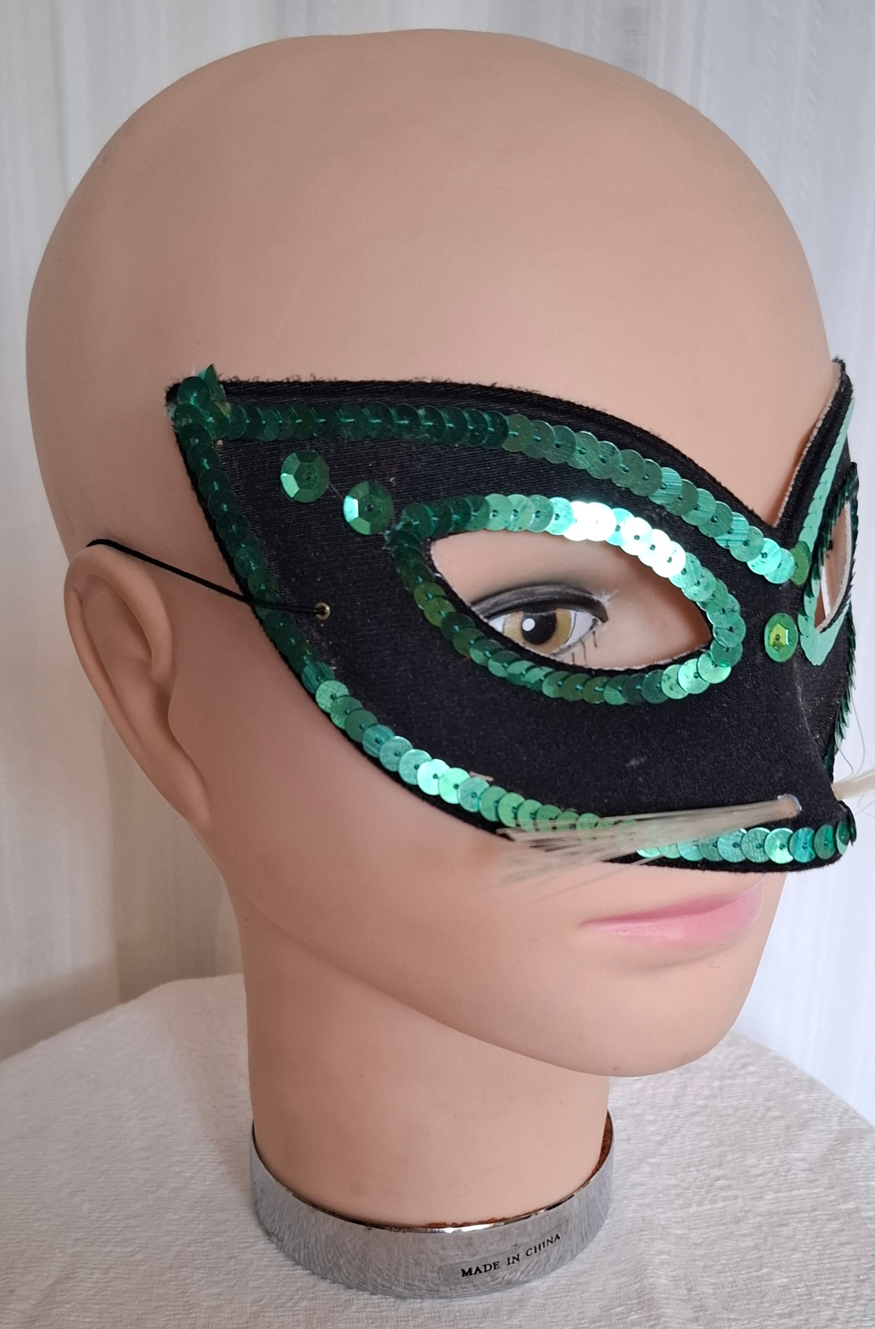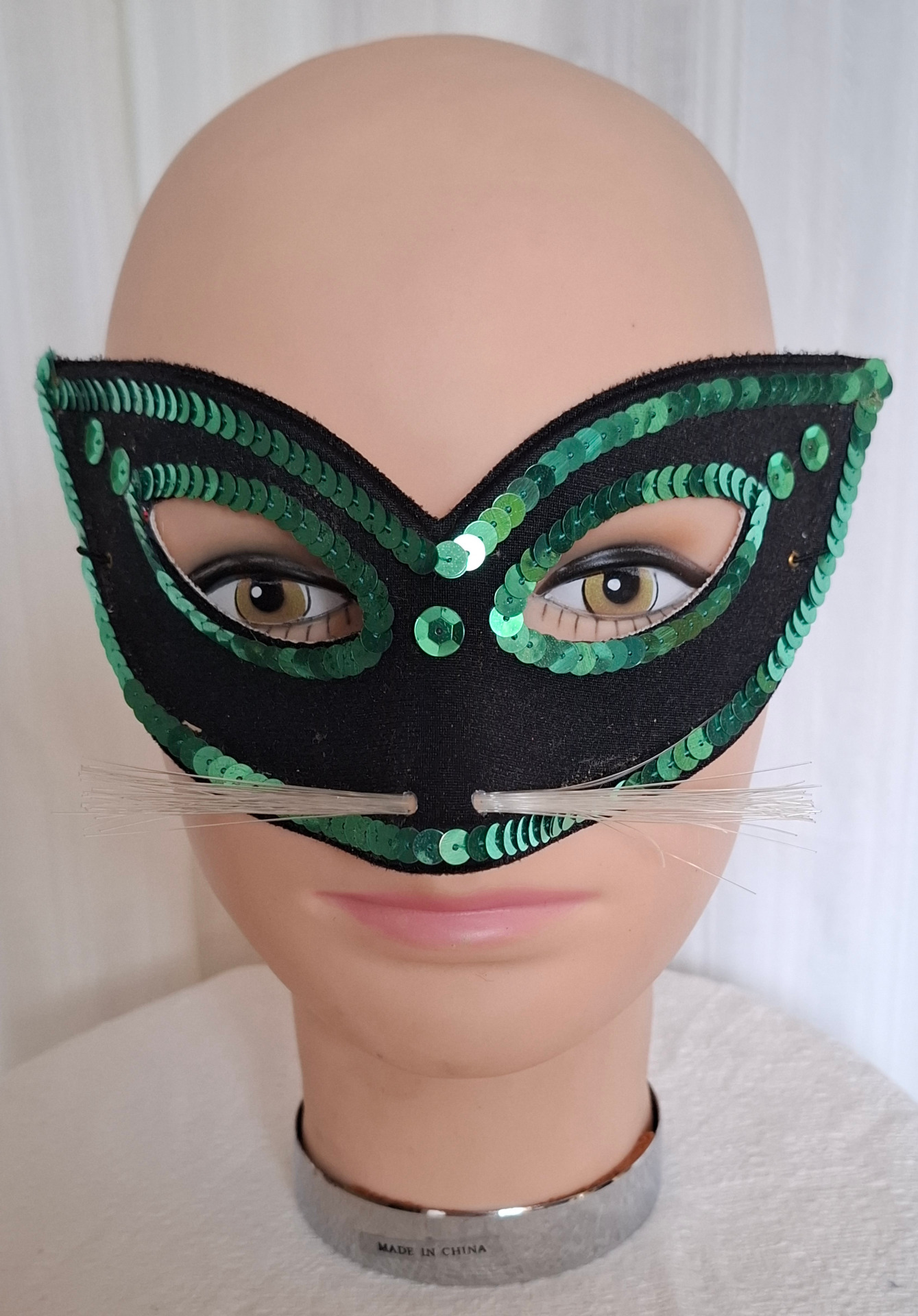 Svart ögonmask med gröna paljetter och vita morrhår. Passar best vuxen.