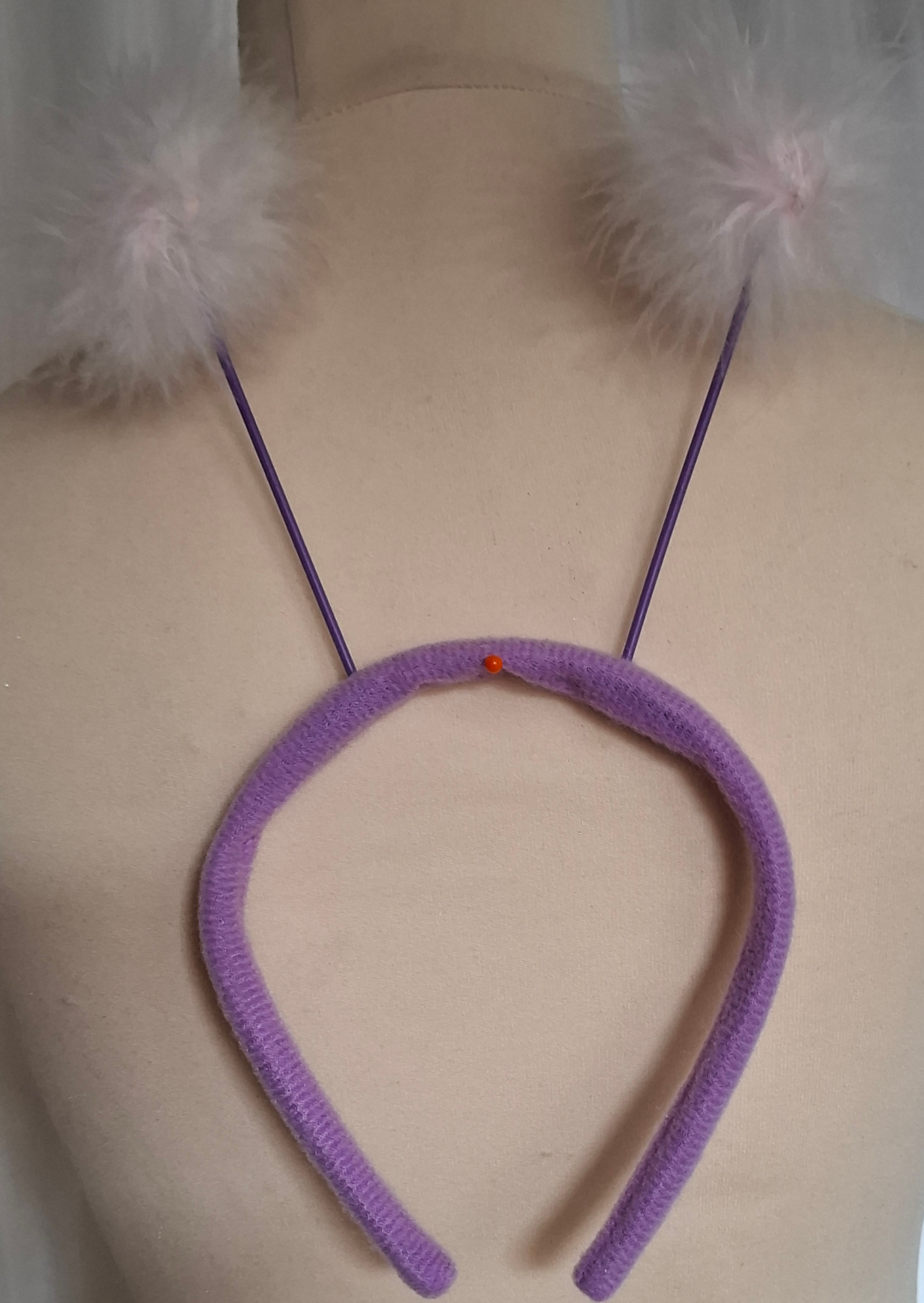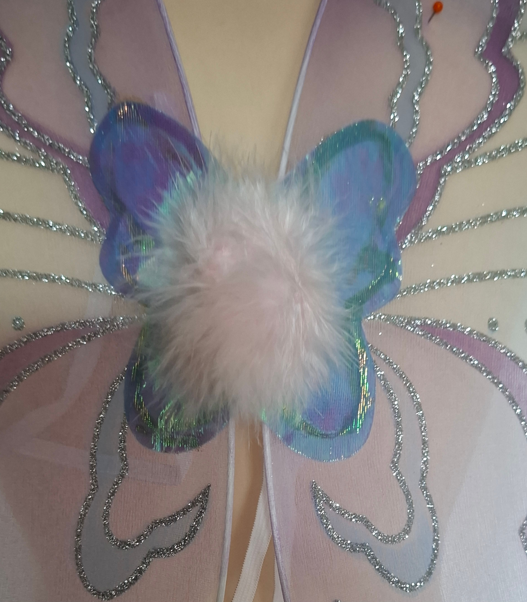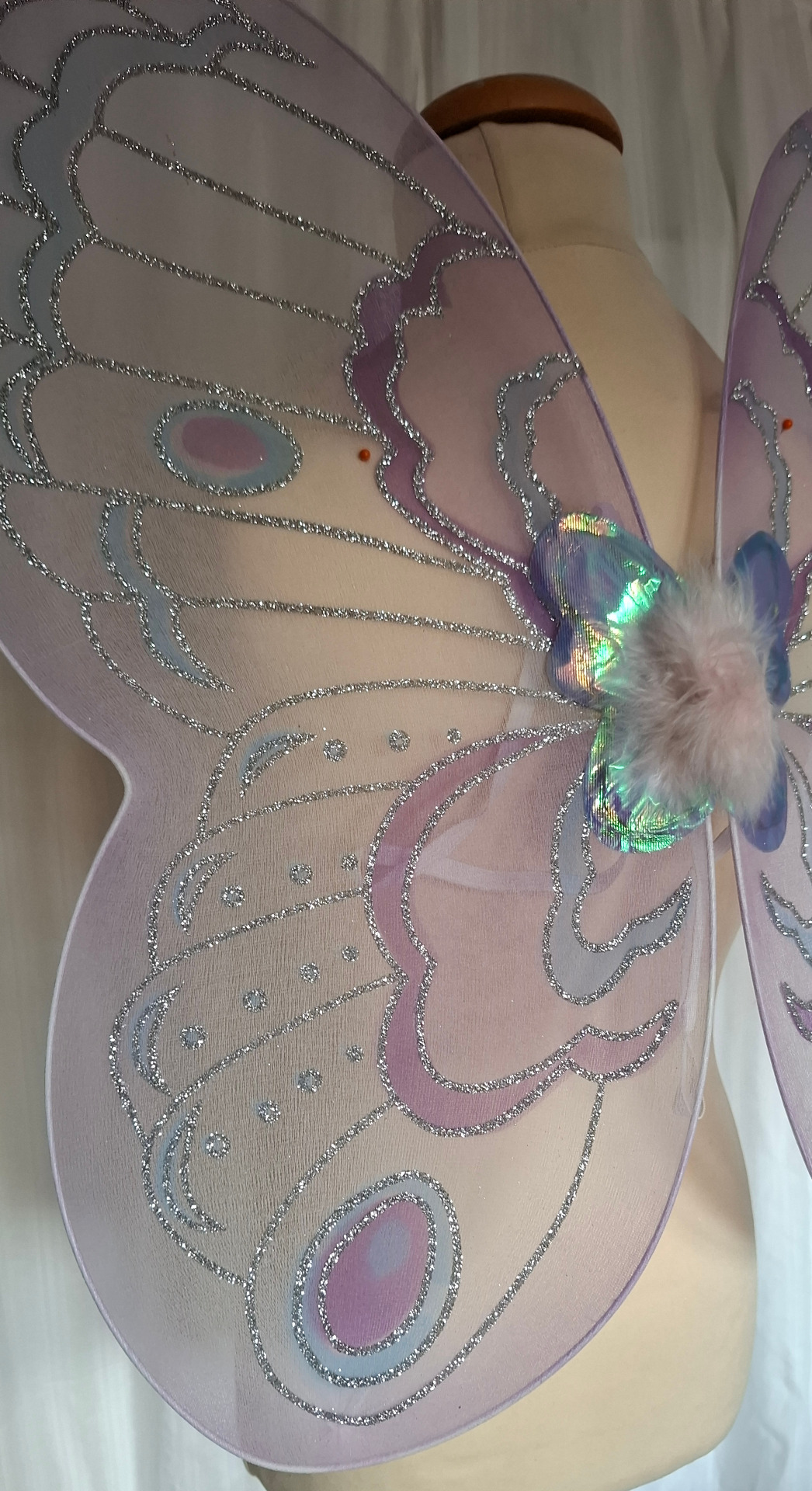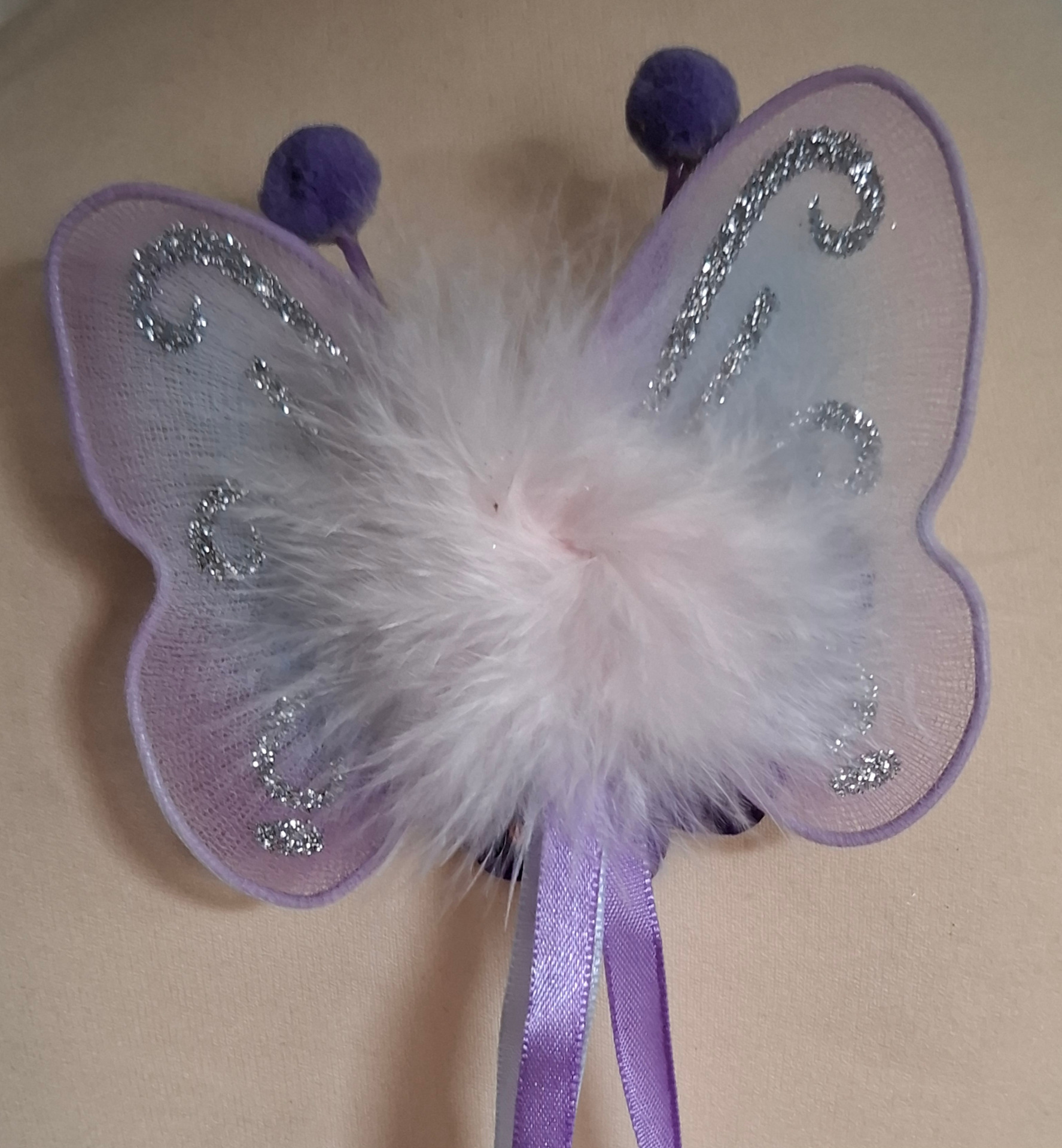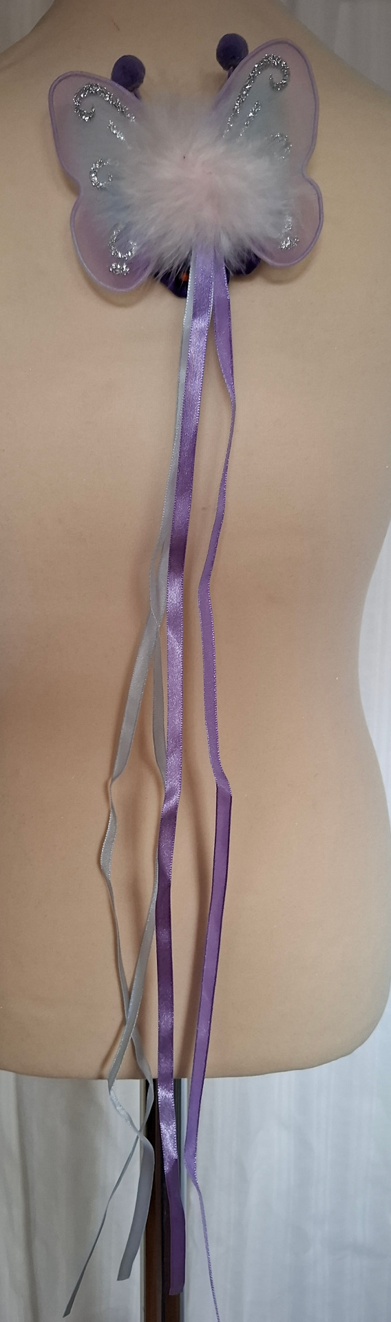 Lila glittriga fjärilsvingar, diadem med dun bollar, hårsnodd med fjäril. Längd på vingarna ca 50 cm.