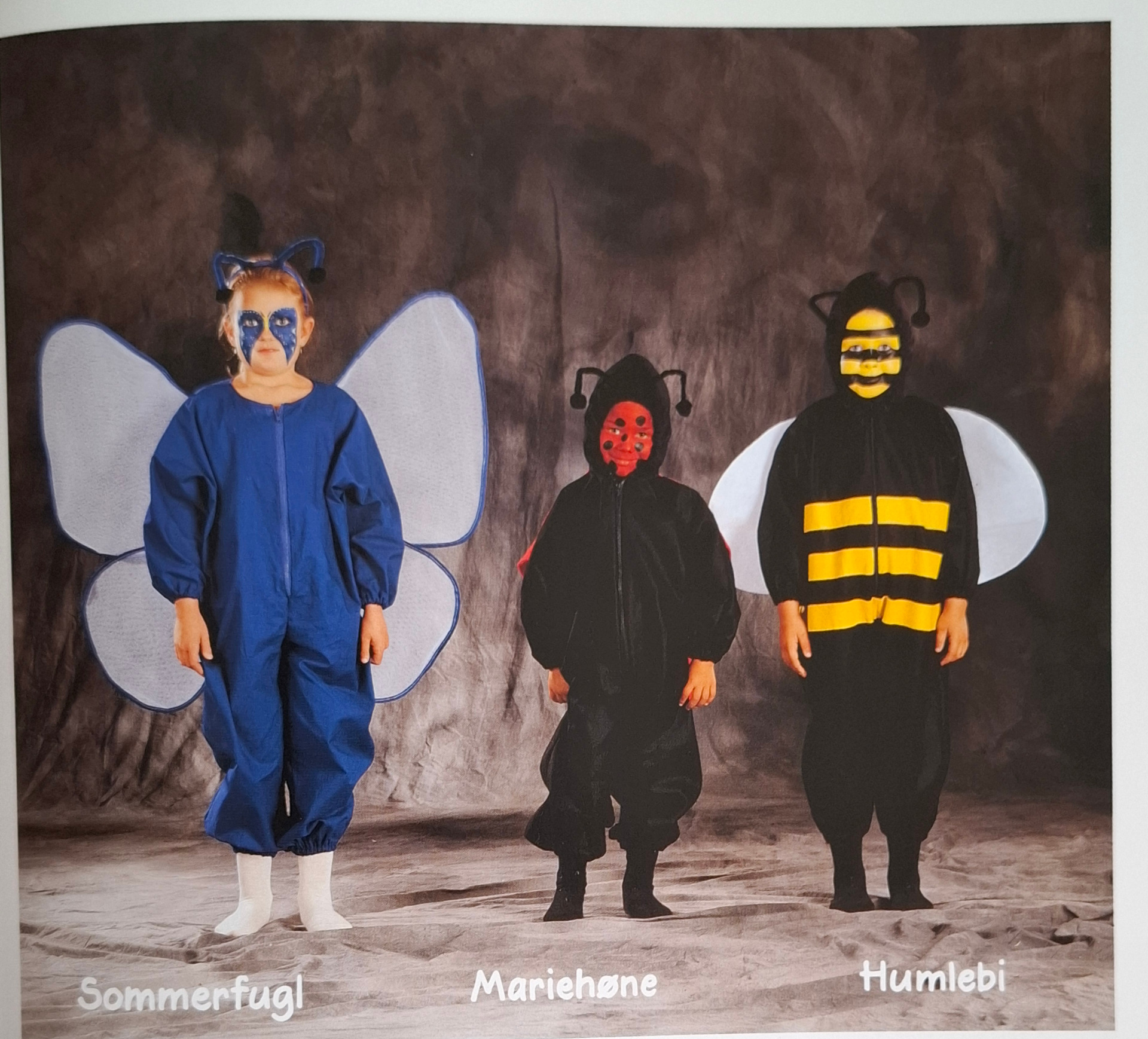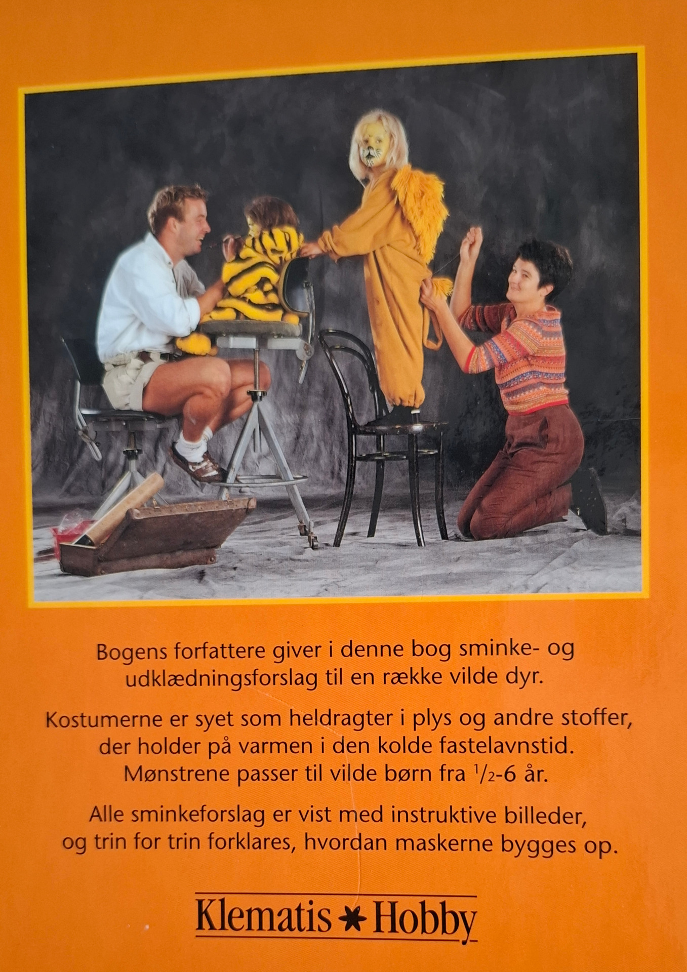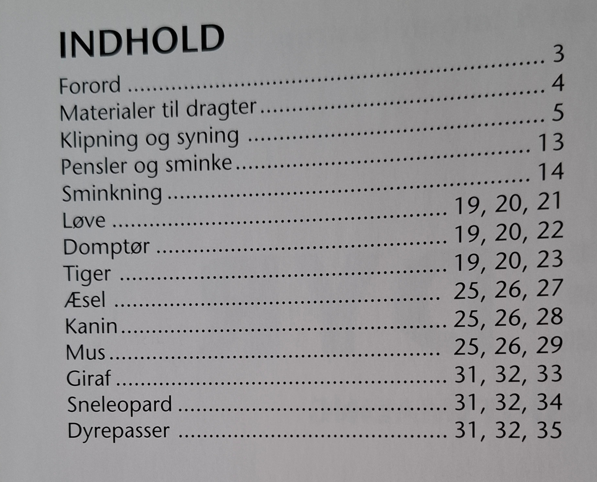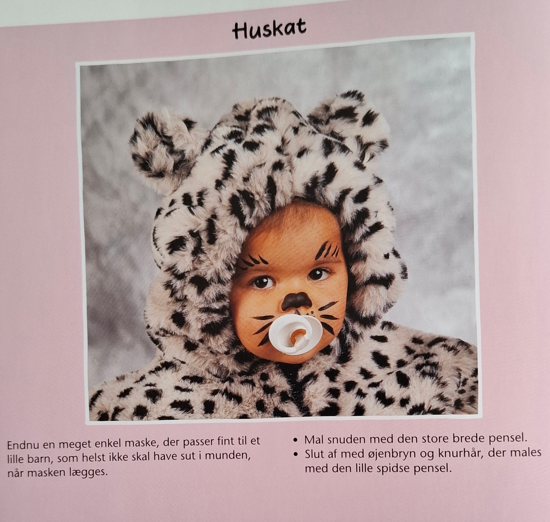 Bok på danska med 60 sidor. Måla ansikten och sy dräkter. Mönster finns i boken att förstora från rutmönster. Dräkterna finns i storlek 1-6 år. Många instruktioner på ansiktsmålning. Material rekommendationer för dräkterna.