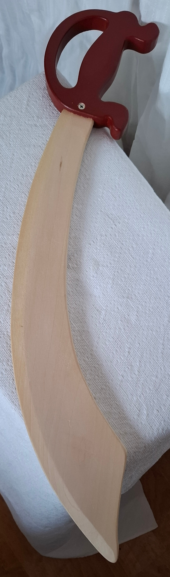 Piratsvärd i trä. Längd ca 55 cm. Handtaget målat, bladet trärent.