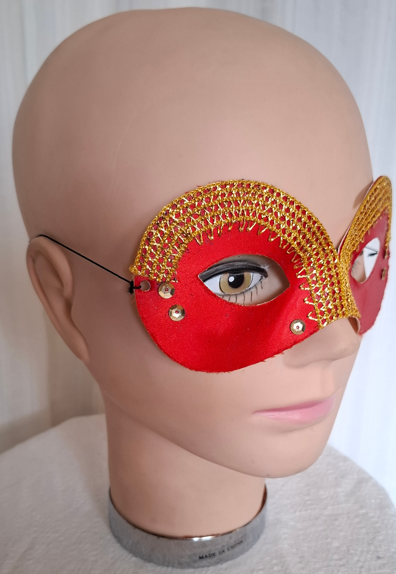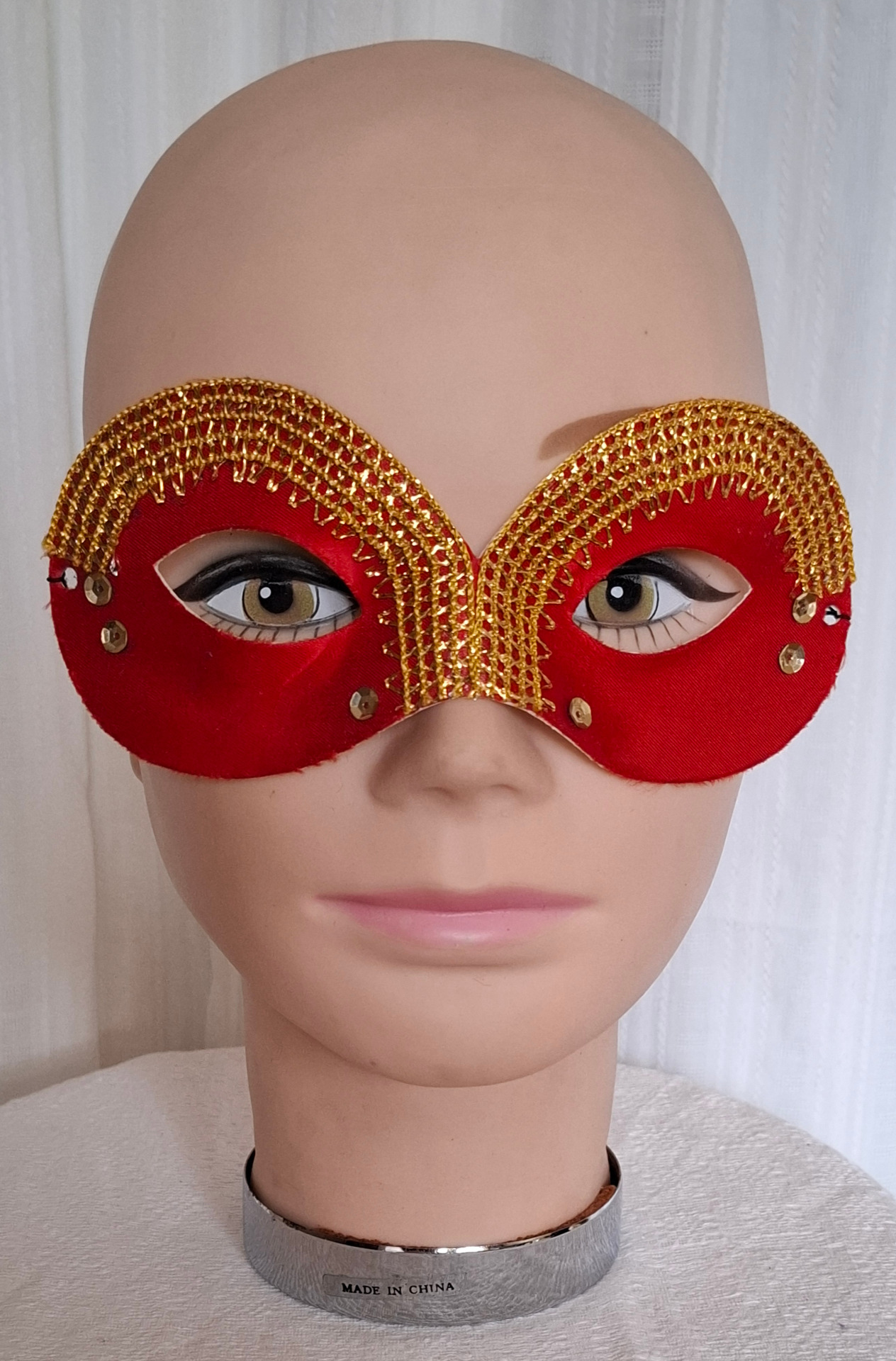 Röd mask med guldband. Passar bäst på vuxen.