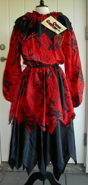 Röd och svart häxklänning. Storlek 44, övervidd ca 120 cm, midja ca 104 cm. Svart knytskärp medföljer. Samma klänning finns till barn.