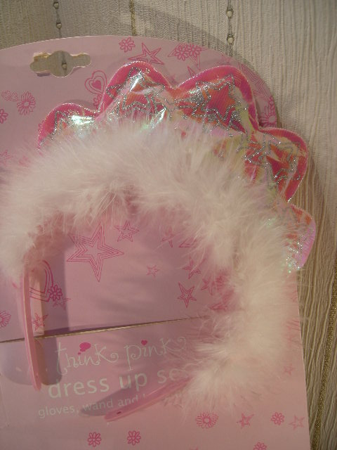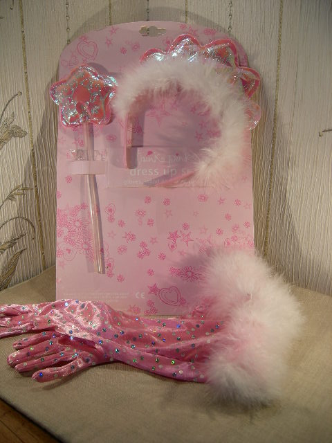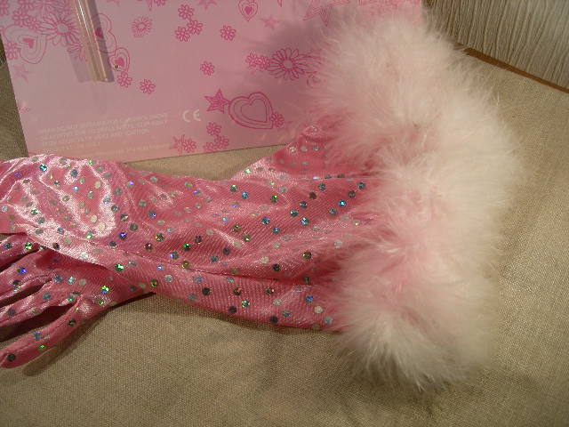 Rosa handskar med paljetter och dun. Diadem med dun. Passar till barn 4-5 år