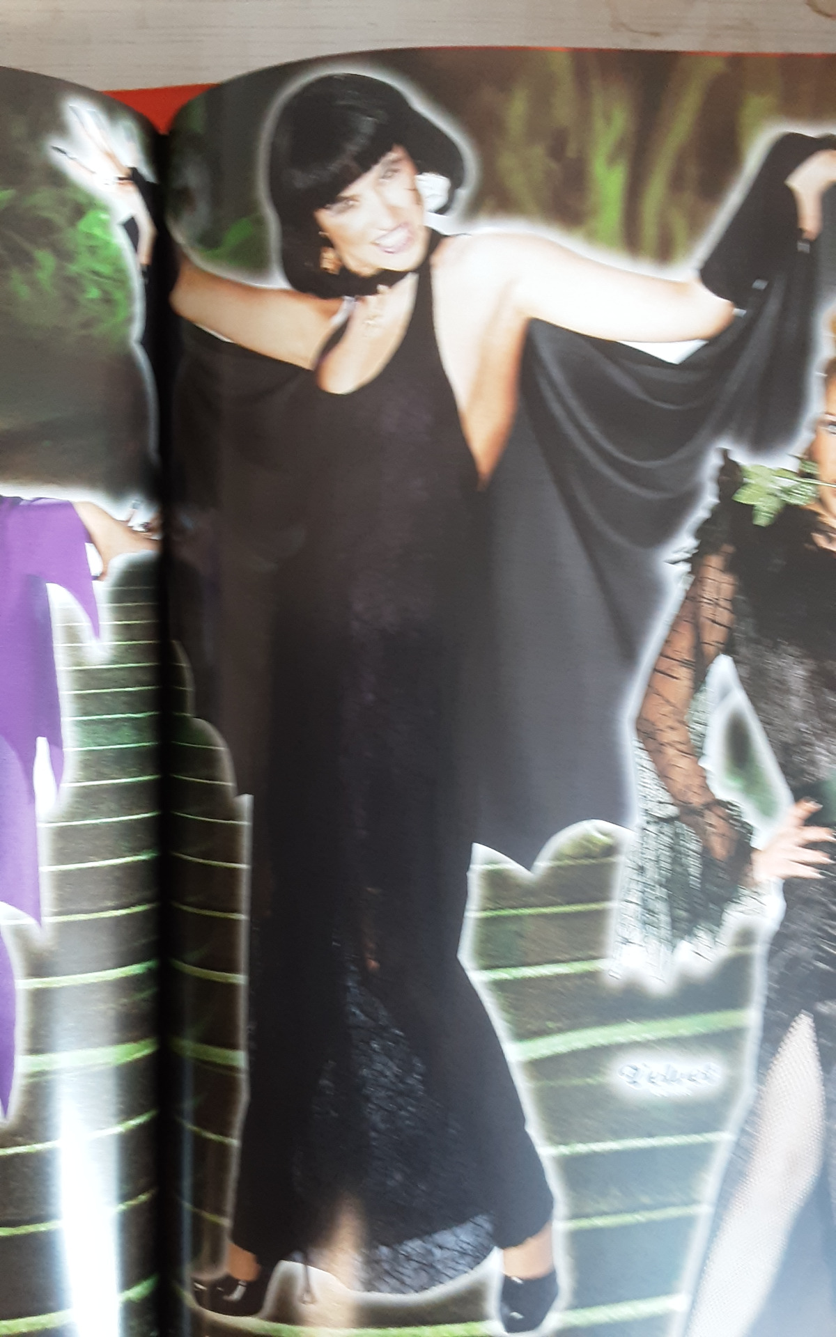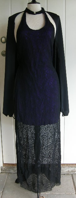 En klänning i lila spets med handskar. Capen är fäst bak. Halsband med sten. Resår i överkant och midja bak. Övervidd ca 90 cm och midja ca 85 cm.
