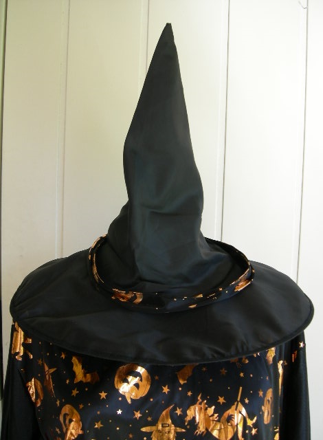 Svart häxklänning med mönstrat fram och bakstycke. Resår i midjan. Hatt medföljer och har mönstrat band runt kullen. Storlek 44, övervidd ca 130 cm, midja ca 110cm.
