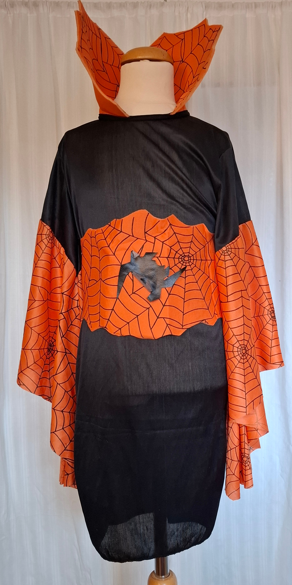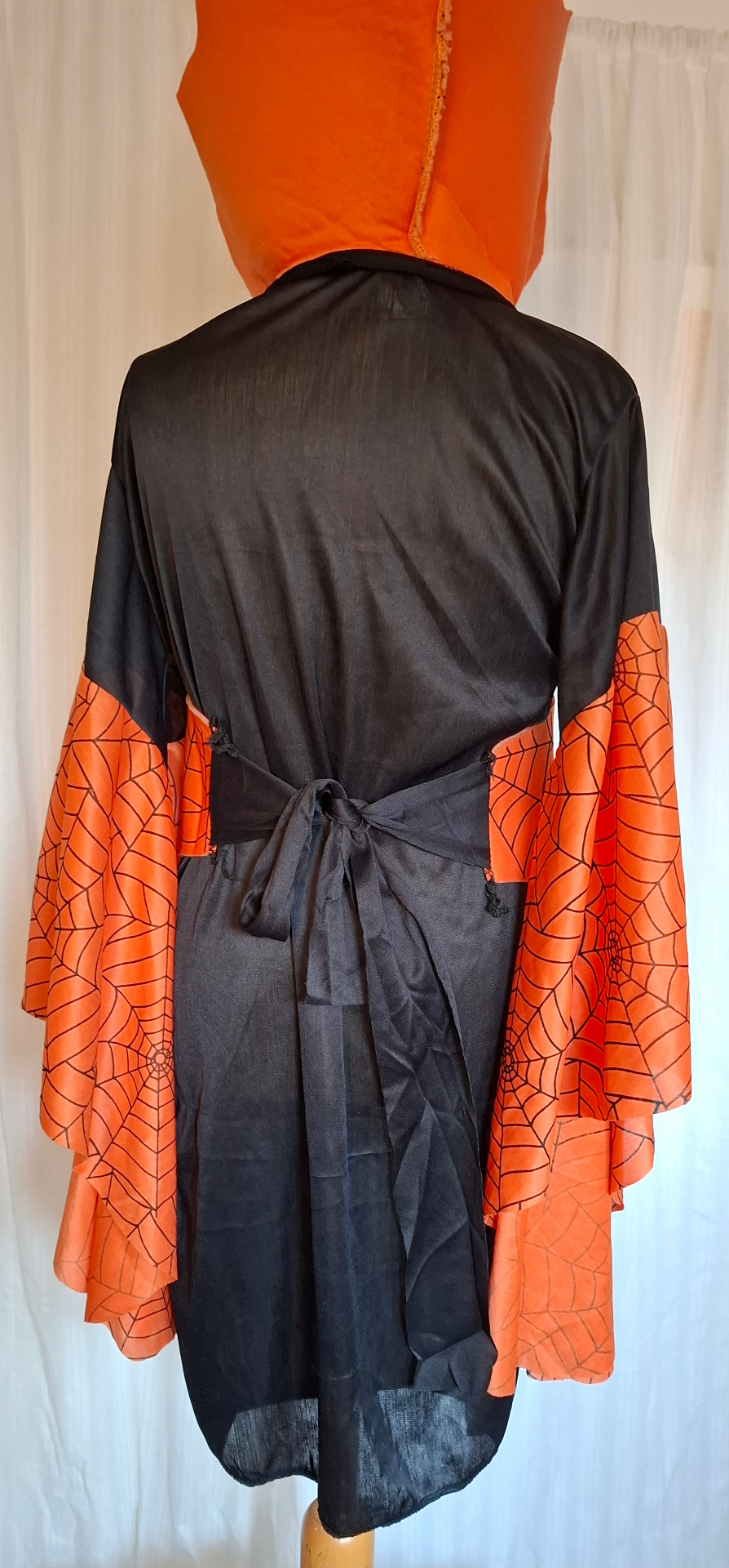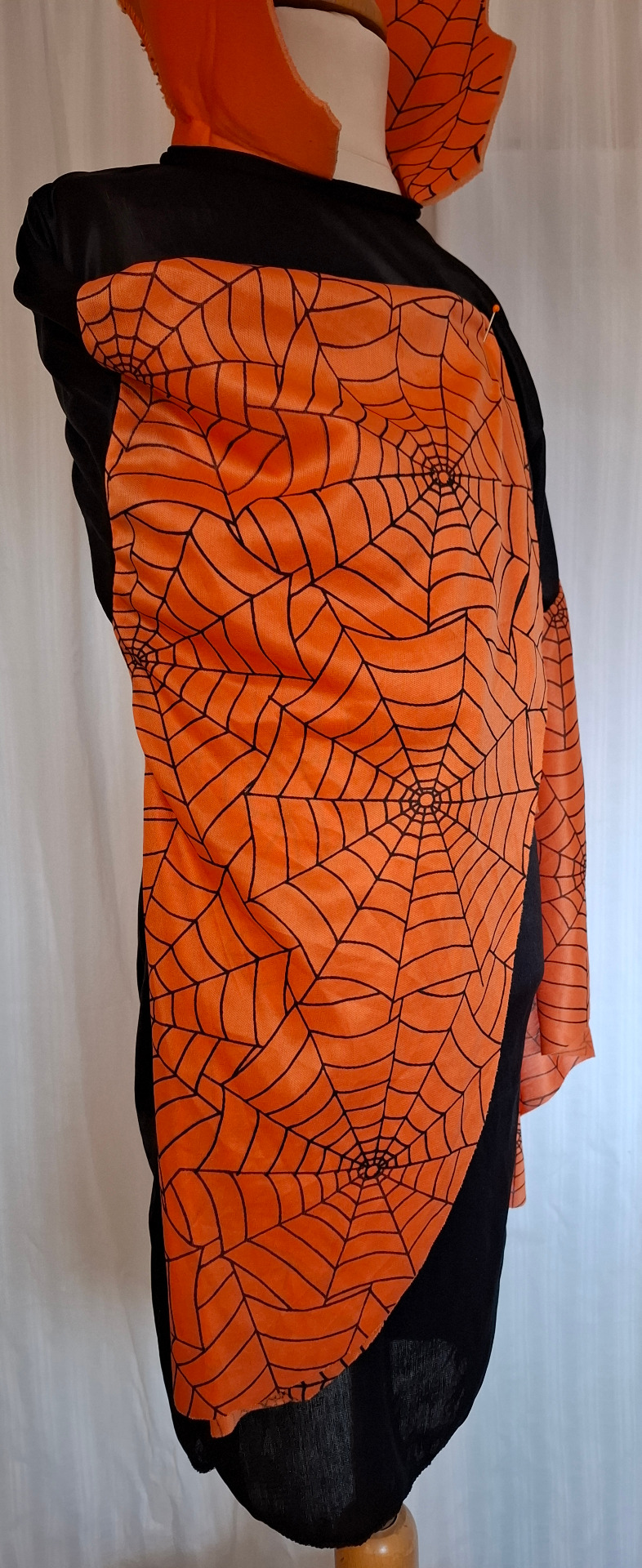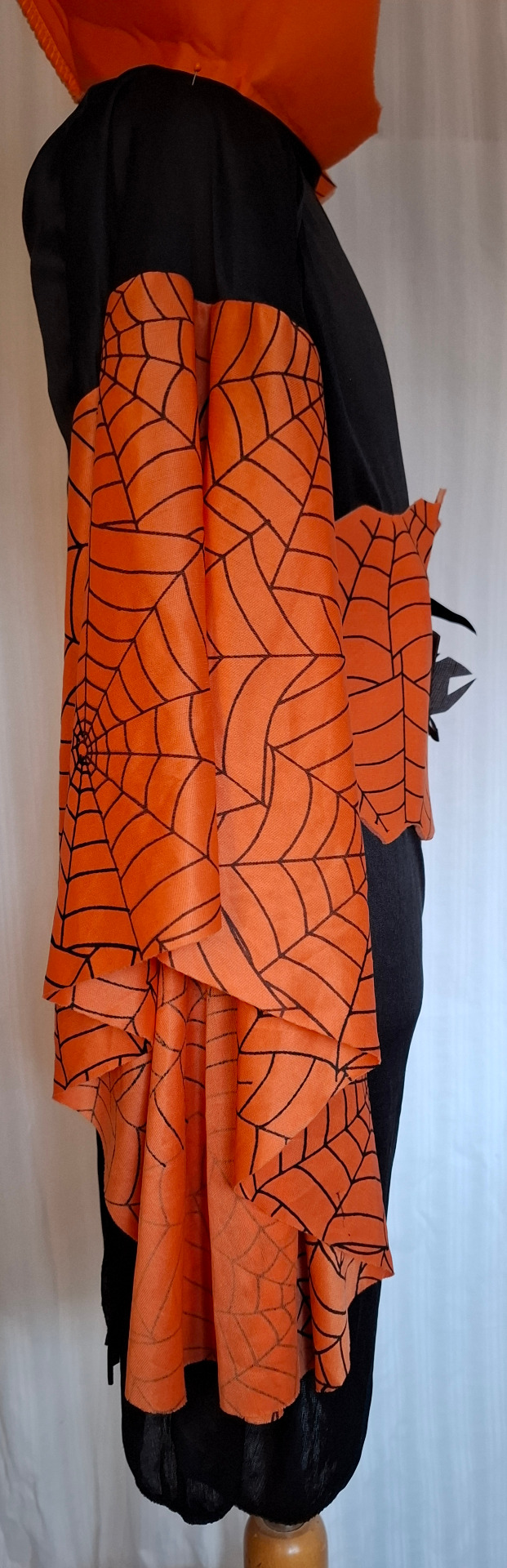 Svart klänning med stor krage i orange med spindelmönster, vida ärmar med spindelmönster och skärp med spindel. Storlek 4-5 år. Klänningen är ganska smal.