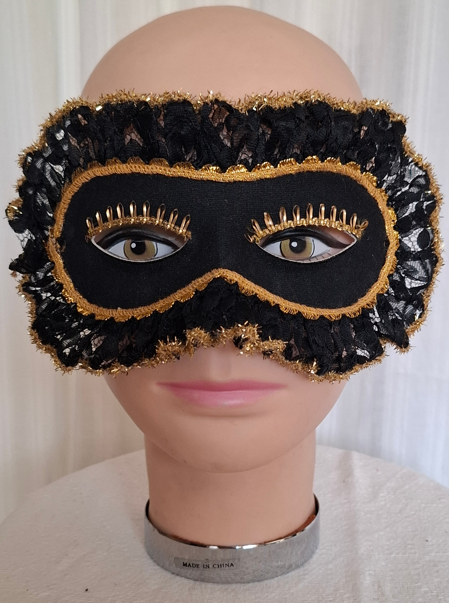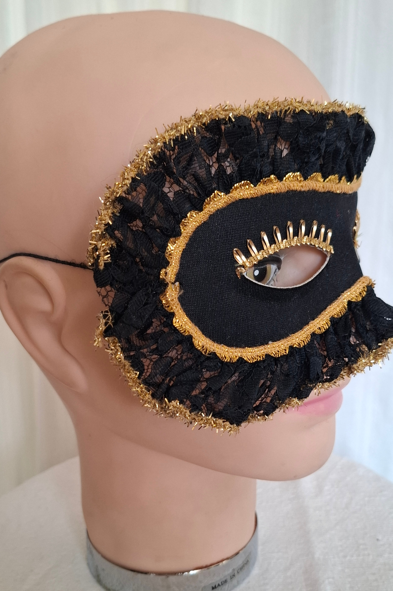 Svart ögonmask med guldband och spets.