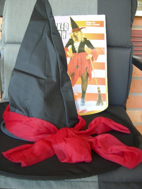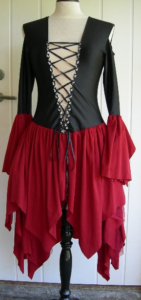 Svart-röd häxklänning med hatt. Klänningen är flikig nertill på kjolen. Snörning fram gör att man kan ändra lite på vidden. Storlek M, övervidd ca 80 cm. Blixtlås i ryggen.