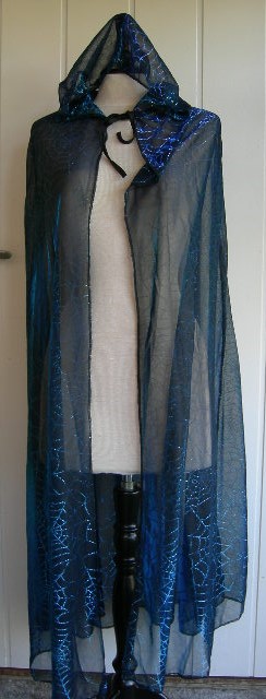 Cape med glittrigt spindelmönster och huva. Blå färg. Längd bak ca 115 cm.
