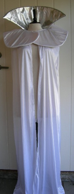 Vit cape med stor dubbelkrage. Ena kragen är vit och den andra i silver. Mask ingår EJ, endast capen.